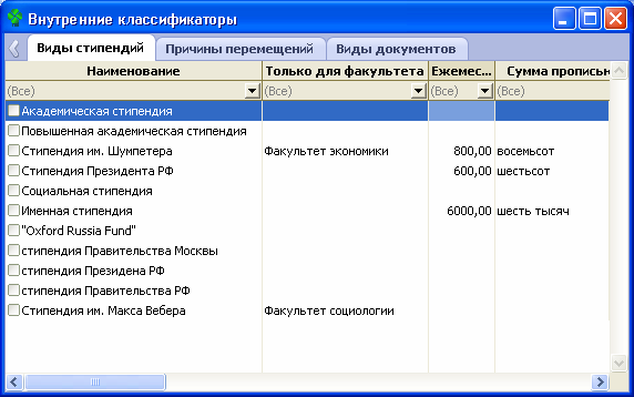 Управление учебным процессом ВУЗа(раздел целиком) Управление учебным процессом ВУЗа - Руководство пользователя участка "Студент" P(разделPцеликом)P(28.01.2013) Руководство пользователя участка "Студент"На участке "Студент" система предоставляет пользователям следующие возможности:Доступ ко всем данным о студентах, собранным в подсистеме "Абитуриент", после выполнения процедуры зачисления на факультет. Ввод, хранение и анализ данных, необходимых в работе со студентами.Формирование и хранение учебных планов в соответствии с действующими в ВУЗе стандартами, включая учет числа зачетных единиц ECTS, учет дисциплин по выбору и факультативов.Автоматизированное назначение каждому студенту перечня испытаний рубежного контроля по периодам обучения на основе учебного плана, персональное назначение студенту дисциплин по выбору и факультативов. Формирование индивидуального учебного плана студента.Формирование перечня испытаний рубежного контроля (сессии или зачетной недели), автоматизированное формирование экзаменационных и зачетных ведомостей.Учет результатов испытаний в различных шкалах (10-балльной, 5- балльной, "зачет"/"незачет"). Возможность хранения тем курсовых и научно- исследовательских работ студентов, мест прохождения практик и т.п.Автоматизированное формирование хода выполнения студентом учебного плана на основе прохождения испытаний рубежного контроля.Средства мониторинга успеваемости студентов факультета (наглядное отображение картины успеваемости средствами системы, формирование списков студентов с перечнем всех оценок за период, формирование списков "должников" и кандидатов на отчисление в соответствии с действующими в ВУЗе правилами).Формирование текущих (за период обучения) и кумулятивных (за весь период обучения в ВУЗе) рейтингов студентов с учетом кредитов (зачетных единиц ECTS).Поддержка процесса назначения студентам стипендий различных видов в соответствии с действующими в ВУЗе правилами.Автоматизированная подготовка к печати академических справок, дипломов и приложений к дипломам, учет выданных ВУЗом документов об образовании.Формирование принятой в ВУЗе отчетности по ходу обучения студентов.Информация, формируемая на участке "Студент", становится доступной всем пользователям Системы:пользователям подсистемы "Абитуриент";пользователям подсистемы "Аспирант";пользователям подсистемы "Выпускник";пользователям подсистемы "Студент" на других участках (факультетах);руководству ВУЗав соответствии с установленными правами доступа. 1. Настройки участка "Студент"Для установки настроек Филиал, Факультет пользователям участка Студент необходимо выполнить следующие действия:На участке Студент открыть один из разделов: Студенты поступление; Студенты учеба; Студенты-личные данные; Справочники факультета; Выпускники факультета. В основной таблице данных вызвать контекстное меню (щелчок правой клавишей мыши) и выбрать процедуру Настройки пользователя.PPPPPPPВ разделе Выпускники факультета вызывать контекстное меню следует не из основной таблицы данных, а из подчиненной, которая располагается ниже.Заполнить форму настроек, а именно поля Филиал, Факультет, при необходимости Курс факультета и нажать кнопку ОК, после чего пользователю будут доступны данные в соответствии с установленными настройками. 2. 